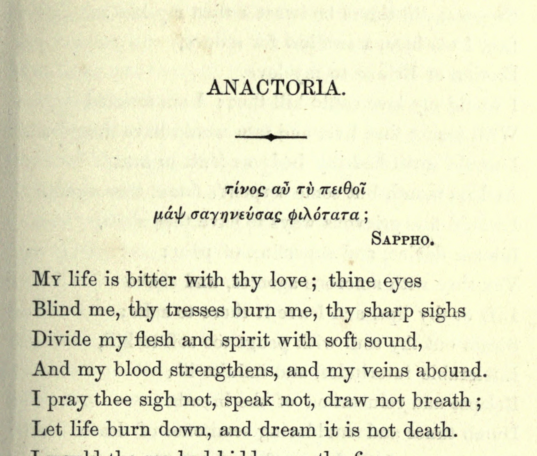 Below is another nineteenth-century example from Swinburne. At the head of his poem “Anactoria” from his 1866 volume Poems and Ballads, Swinburne quotes the Greek poet Sappho. “Anactoria” is a dramatic monologue in which the speaker, Sappho, addresses her lover, Anactoria.