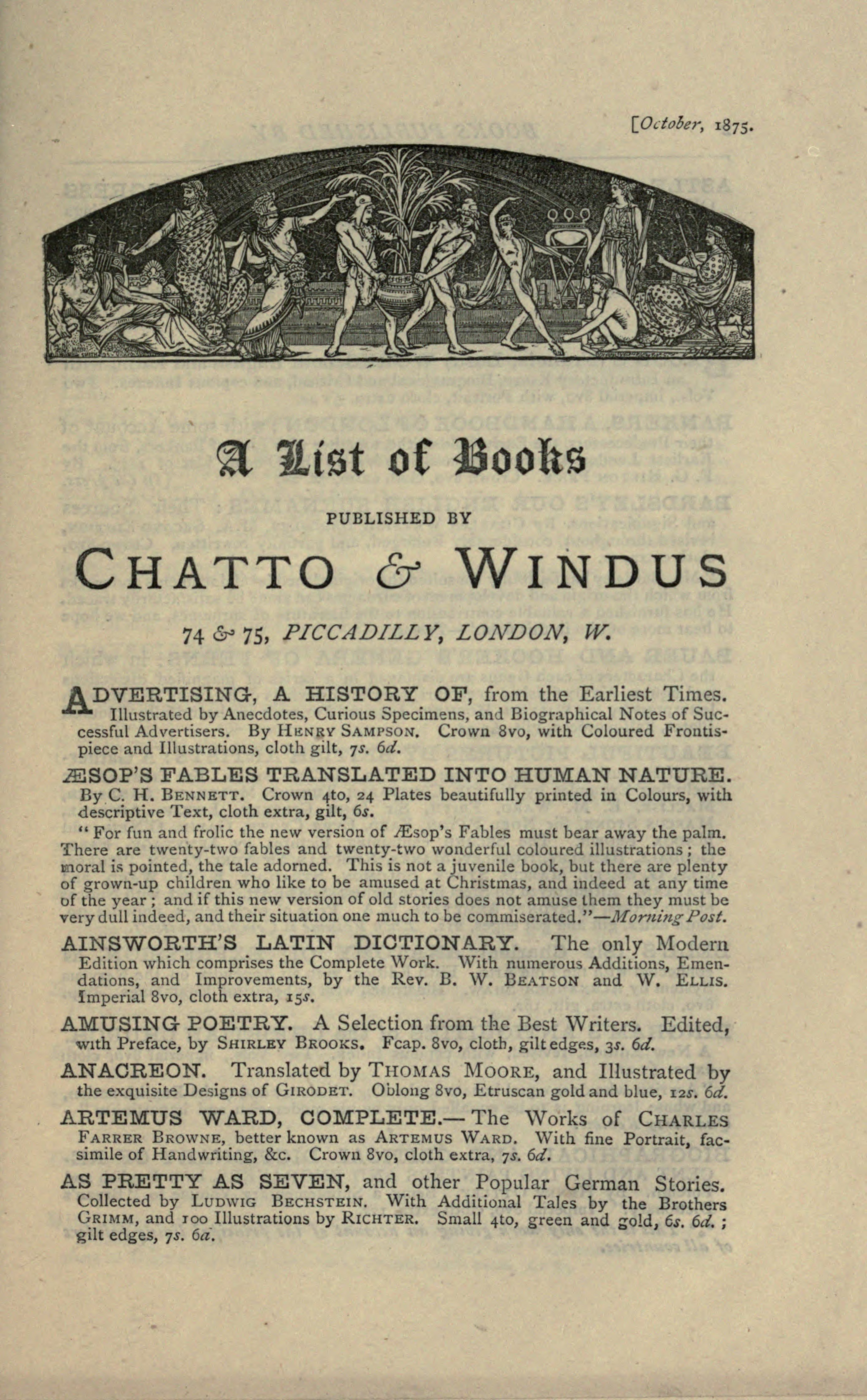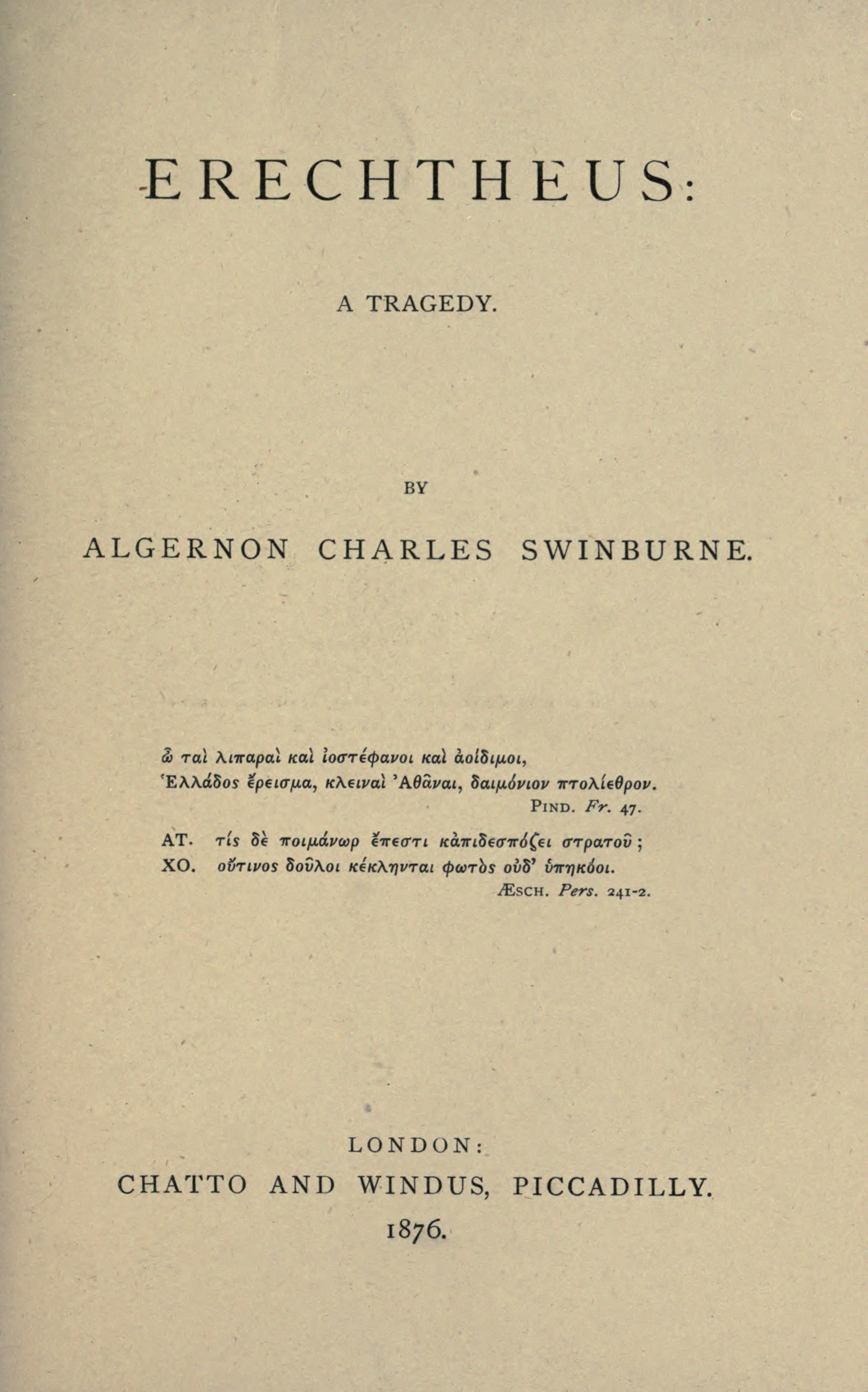 The interior title page for a 19th-century book of poetry contains a great deal of information. The example below, from Swinburne’s Erechtheus (1876), includes the title of the work, the name of the author, two epigraphs — quotations from Pindar and Aeschylus, the place of Publication, the publisher, and the date of publication.